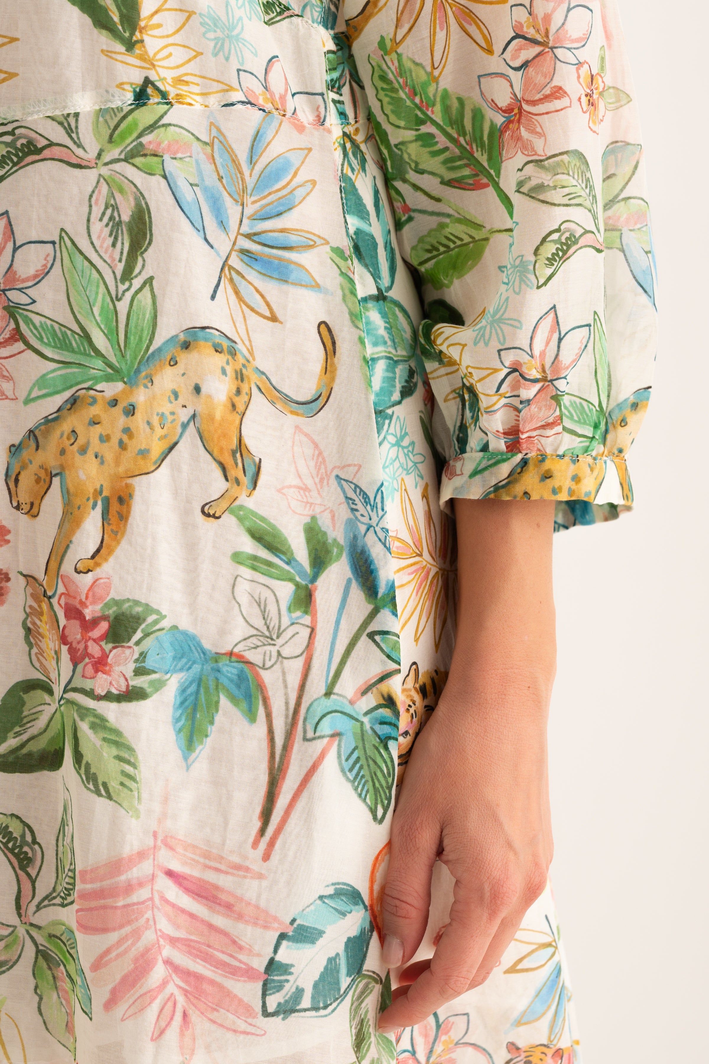 Vibrant jungle-themed print featuring a mix of exotic flora and fauna in a colorful palette.