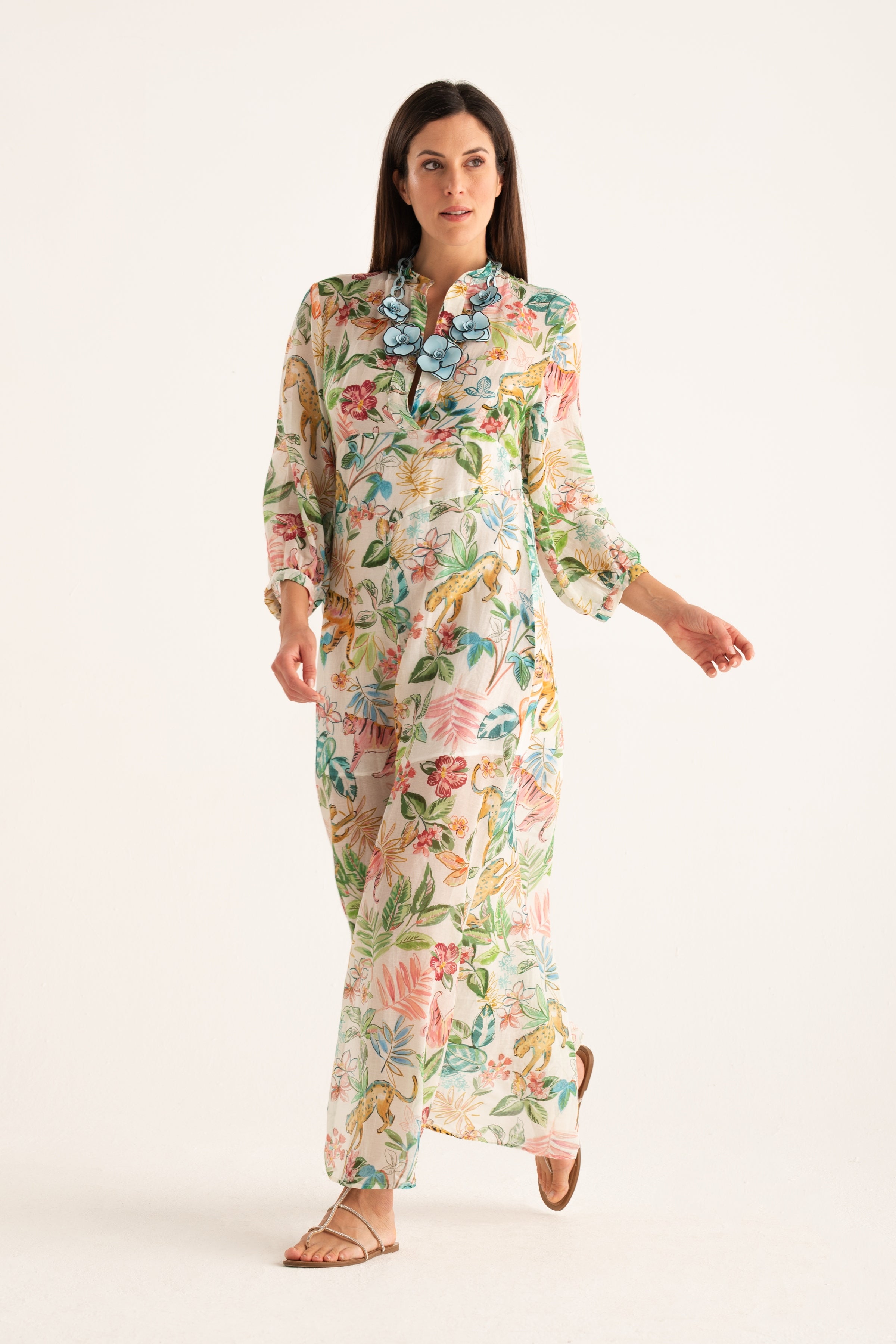 Crafted from breathable pure linen, this regular fit maxi dress features a vibrant jungle-themed floral and animal print. The design highlights a sophisticated floor-length silhouette, combining artistic patterns with classic tailoring for an elegant summer look.